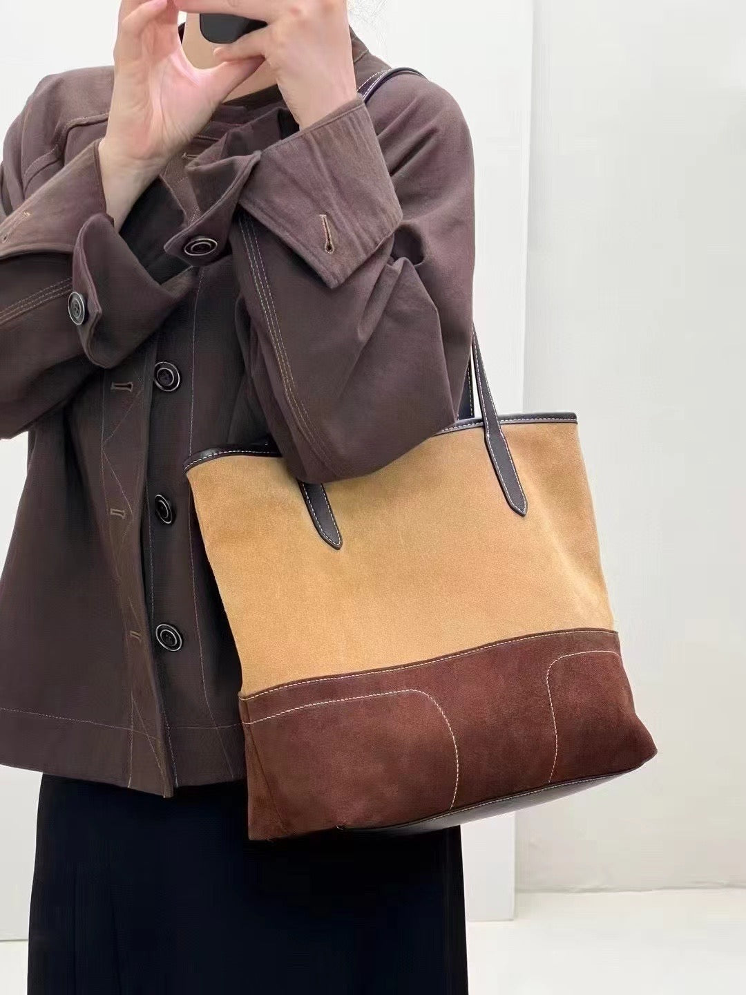Elevate your everyday style with this medium-sized tote bag, crafted from premium suede calf leather. The beautiful caramel and chestnut brown color block design adds a warm, sophisticated touch to any outfit ā whether you're heading to work, shopping, or a casual day out.